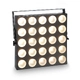 With a 5 x 5 array of warm white 3 watt LEDs and flicker-free performance the Cameo Matrix Panel creates exciting blinder, chase and strobe effects. Featuring powerful single pixel control it is the perfect choice for mapping alphabetic characters, numerals and complete messages. Recessed latches on all sides enable connecting multiple panels for large, impressive backdrops. The Matrix Panel includes four modes of DMX control, sound activation and 4 selectable dimming curves. It sports master, slave and standalone capability plus highly efficient convection cooling for noiseless operation. The ultra flat all-metal enclosure provides 3-pin DMX input and output, blue and white power connectors, a bright 4-button display and safety eye. The Matrix Panel comes with a mounting bracket and runs on all voltages from 100 – 240 volts AC.